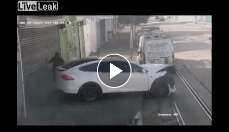 A man loses control of his Tesla and hits a vehicle. The man only inches from being hit.
